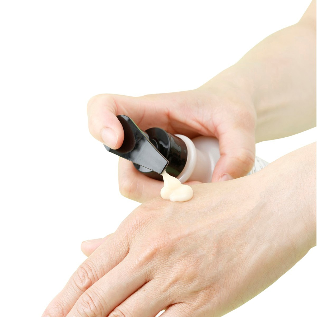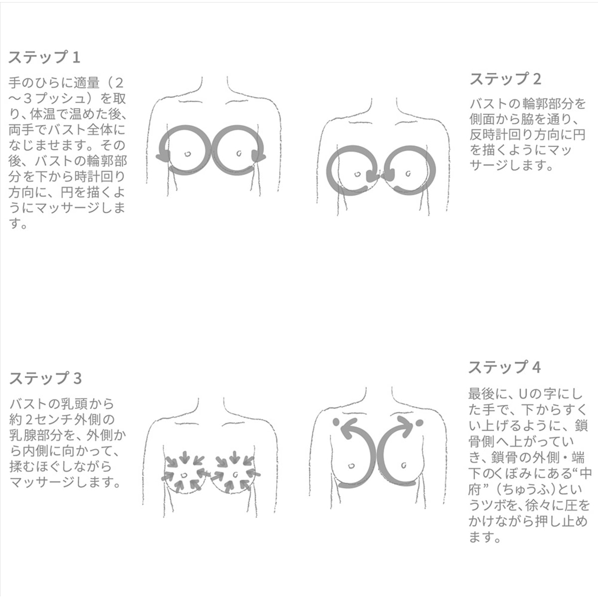 手のひらに適量(2~3プッシュ)を取り、体温で温めた後、両手でバスト全体になじませます。