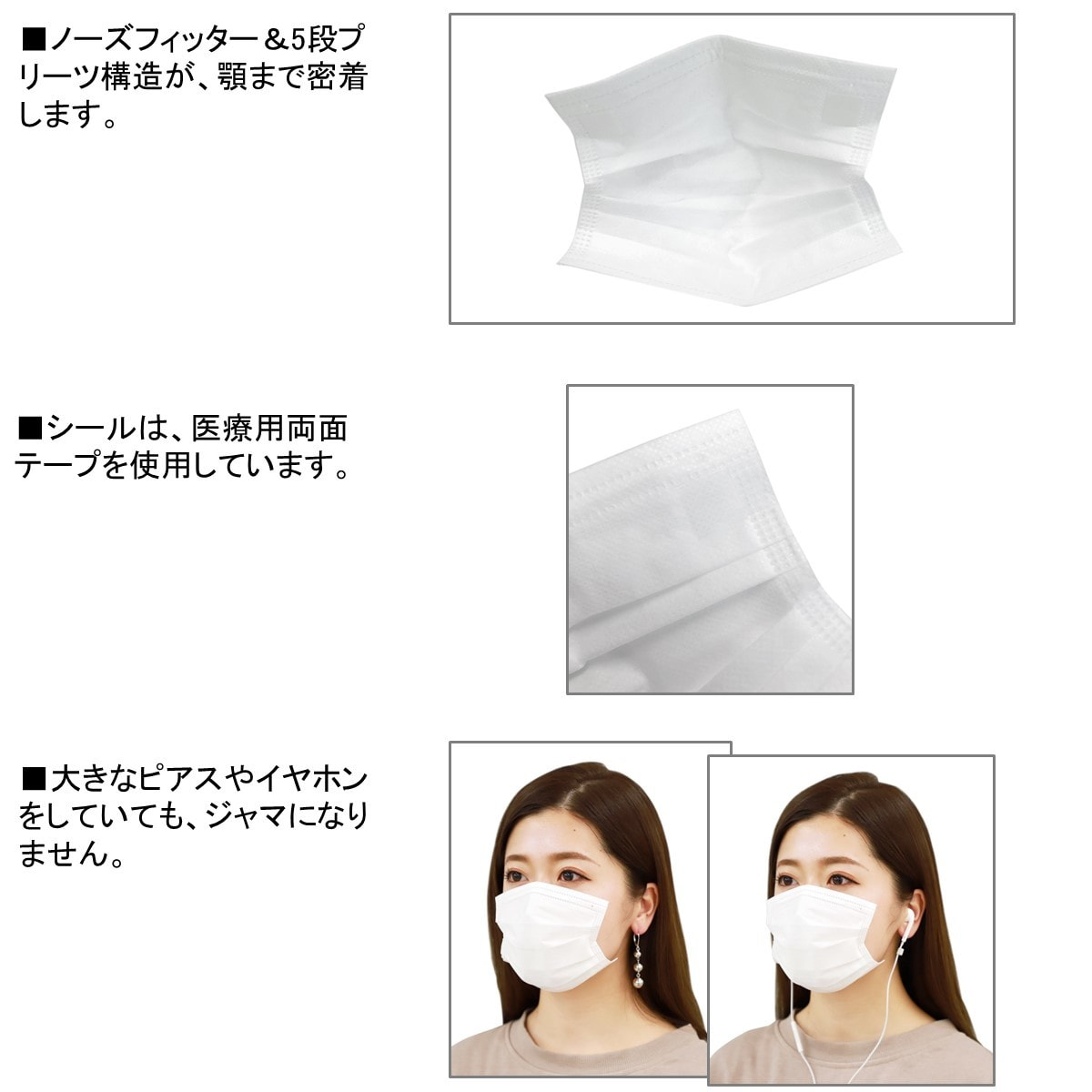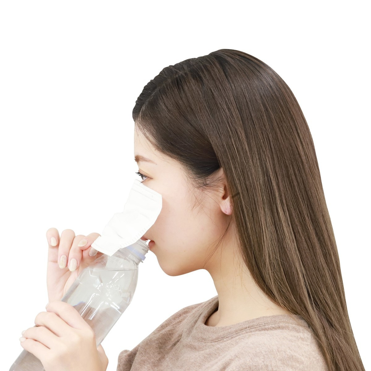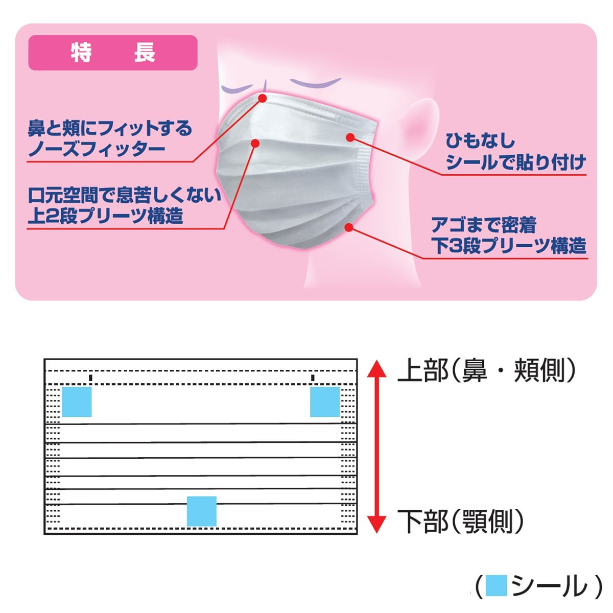 マスクの内側に装着したシールで顔に貼り付ける、ひも無しタイプの使い捨てマスクです。