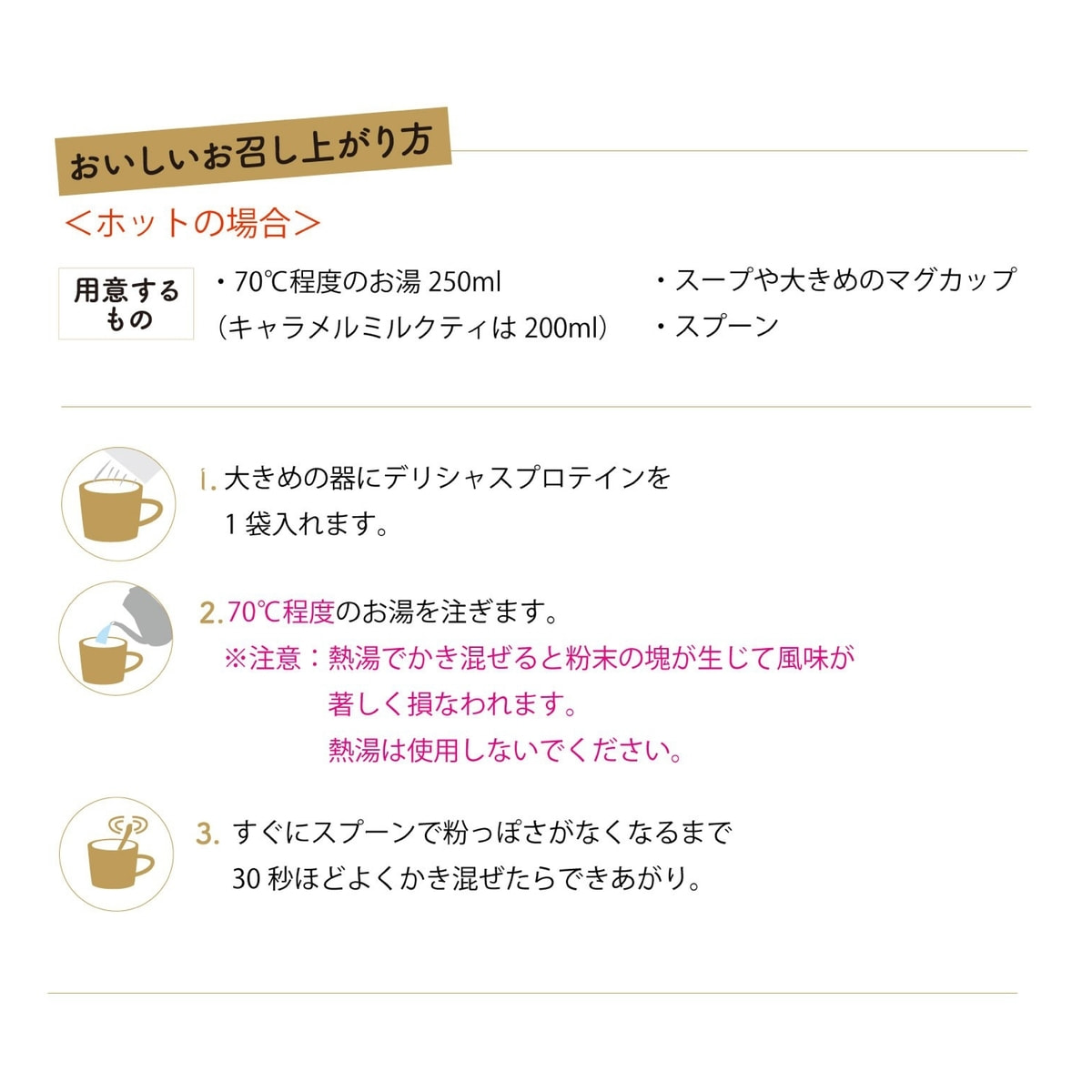 デリシャスプロテインはその名の通り、スープやカフェの飲み物のように美味しくプロテインを摂取できるホエイプロテインです。