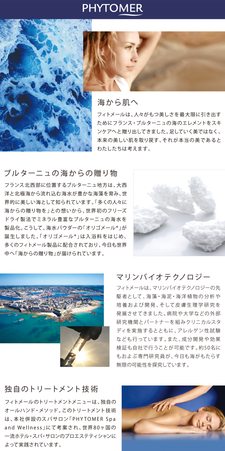 1970年代、フランスブルターニュ地方サンマロで誕生したフィトメールは、現在数多くの特許を取得した様々な有効成分を保持し、世界的に大規模なマリンバイオテクノロジーの先駆者として、世界80ヶ国以上の有名ホテルスパ・エステティックサロンで愛用されています。FACE・BODY別に、ラグジュアリーなトリートメントが展開可能。