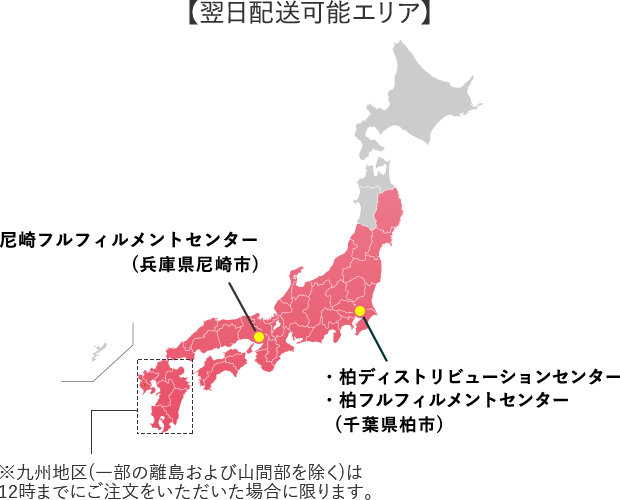 東西の物流拠点により、ご注文のお届け先に近い拠点から出荷。配送リードタイムを短縮することで、日本全国のお客様(一部地域を除く)へ、最短翌日着※1で商品をお届けすることが可能となりました。