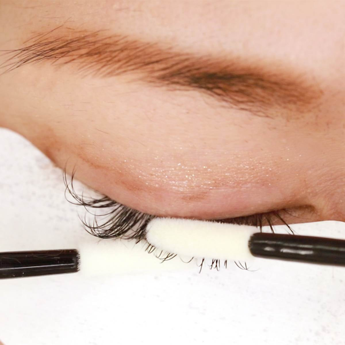 7.乾いたラッシュチップでまつ毛をやさしく挟んでドライオフをする。
