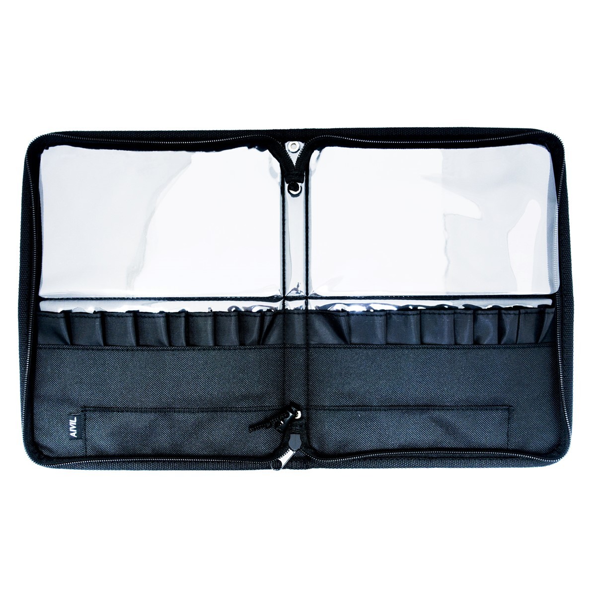 持ち運び用のブラシポーチとしてはもちろん、ストッパーを引っ張ると自立するのでそのままブラシ立てとしても使えるブラシケースです。