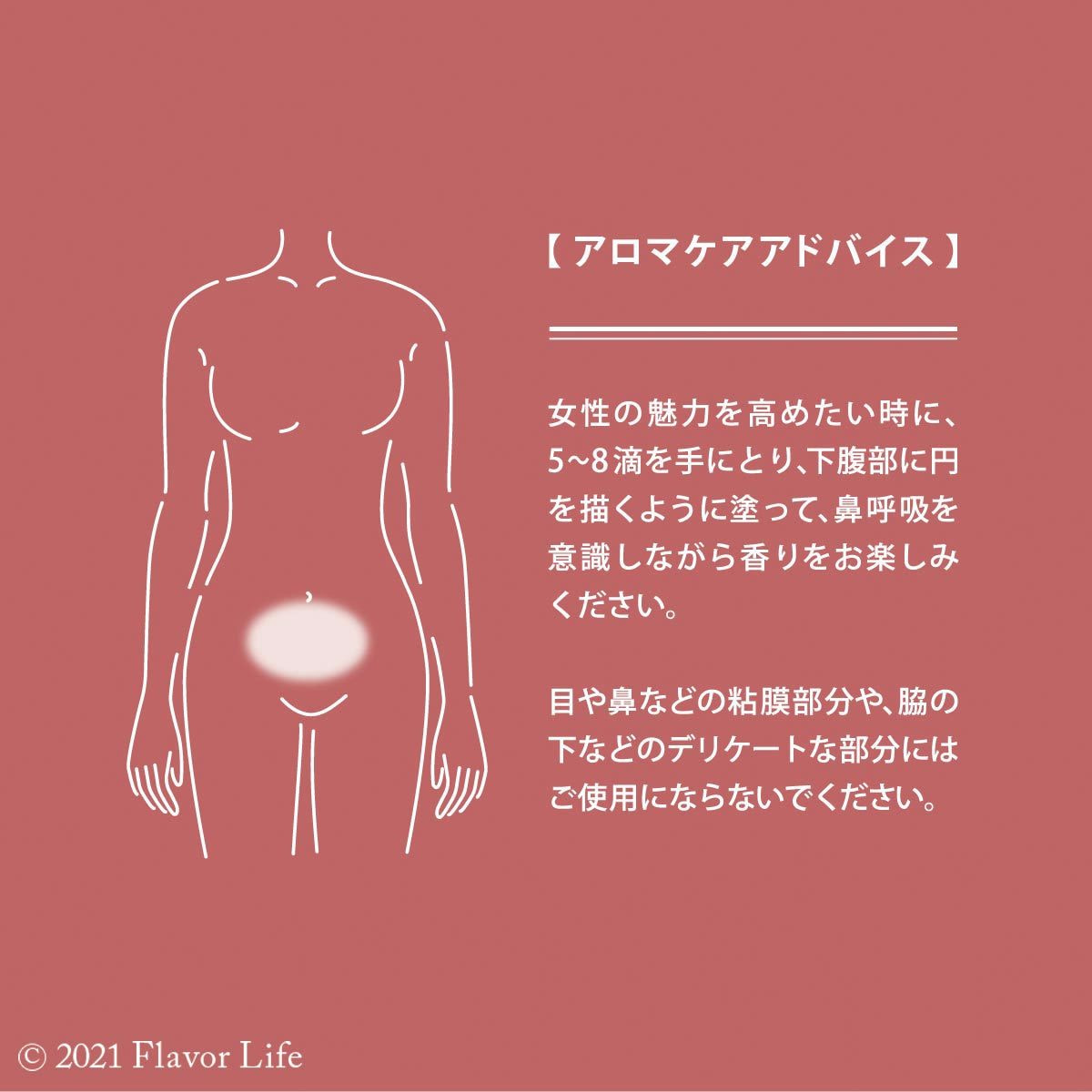 女性の魅力を高めたいときに、5~8滴を手にとり、下腹部に円を描くように塗って、鼻呼吸を意識しながら香りをお楽しみください。
