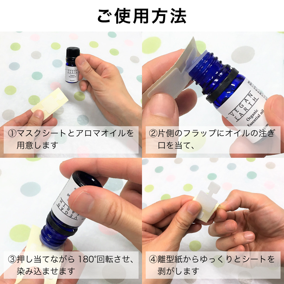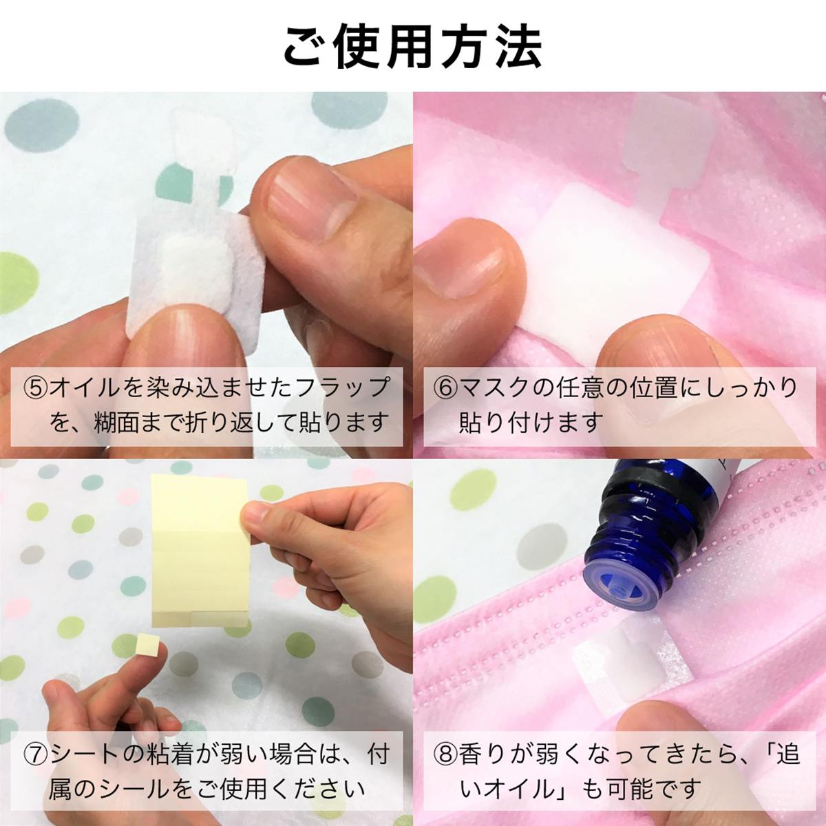 ・精油を染み込ませる時は、精油容器の口を予めアロママスクシートのフラップで塞いだ状態で逆さにし、1滴分を含侵させてください。