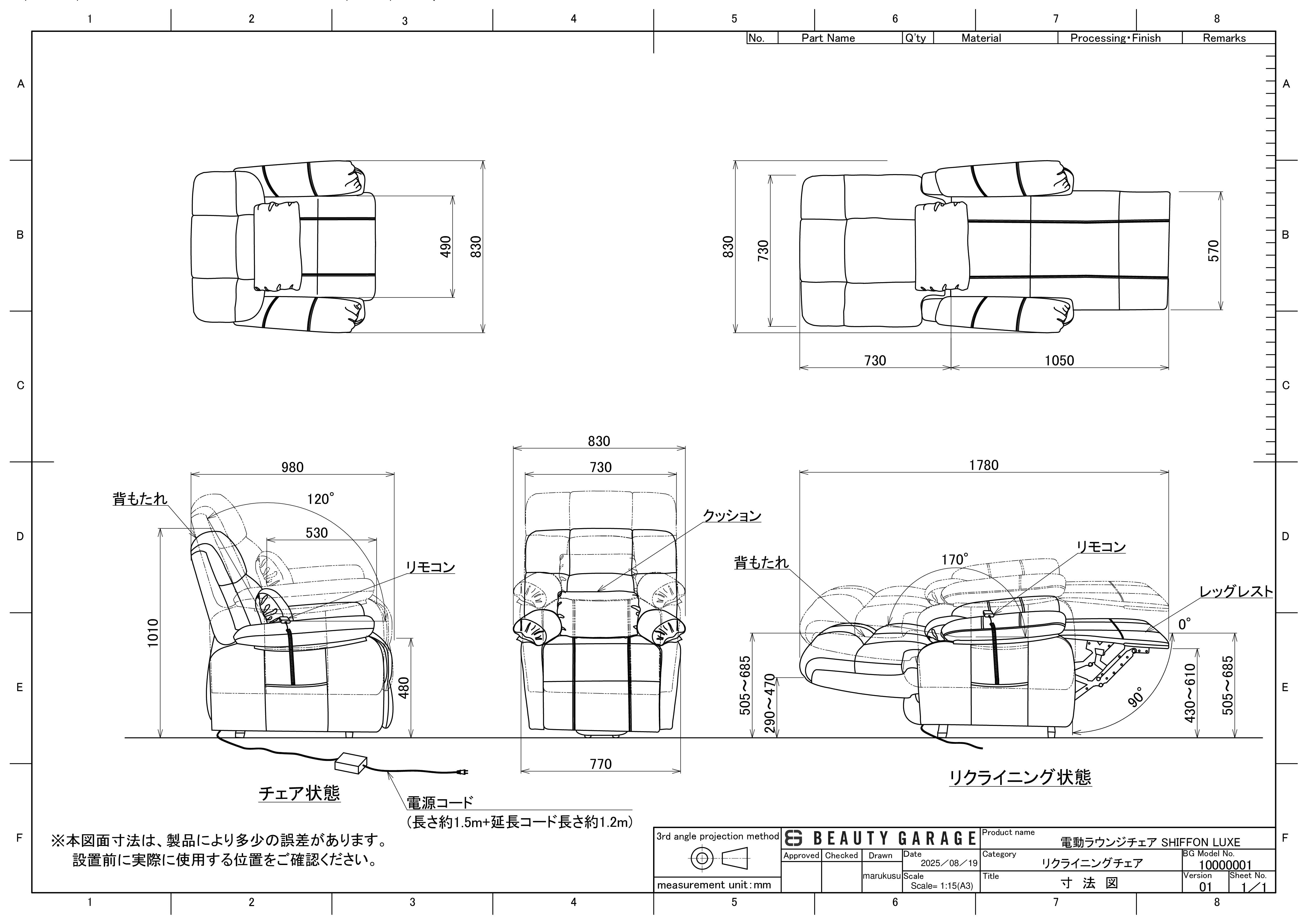 ■リクライニング時:W83 × D178 × H50.5~68.5cm