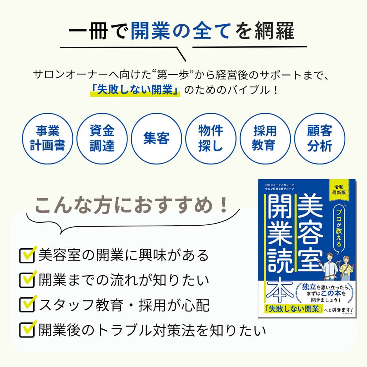 本書は、ビューティガレージがこれまで培ってきた膨大な開業支援のデータと事例に基づき、「失敗しない開業」のためのポイントを徹底的に解説しています。