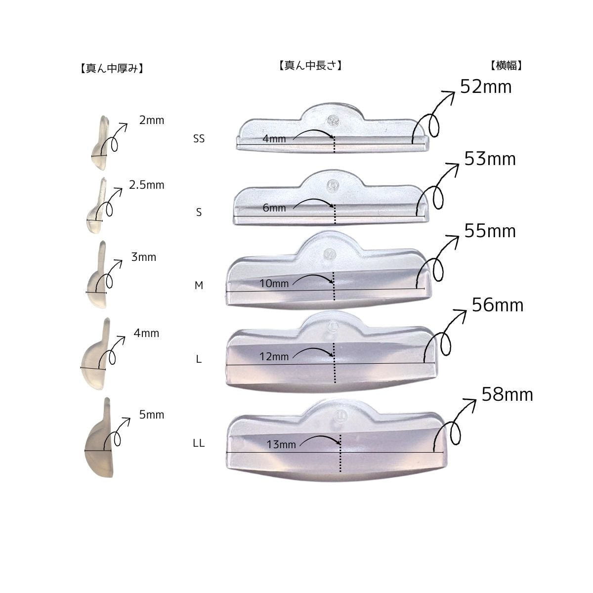 短めまつ毛や下まつ毛にも使用できる小さめサイズを含む5サイズセット。