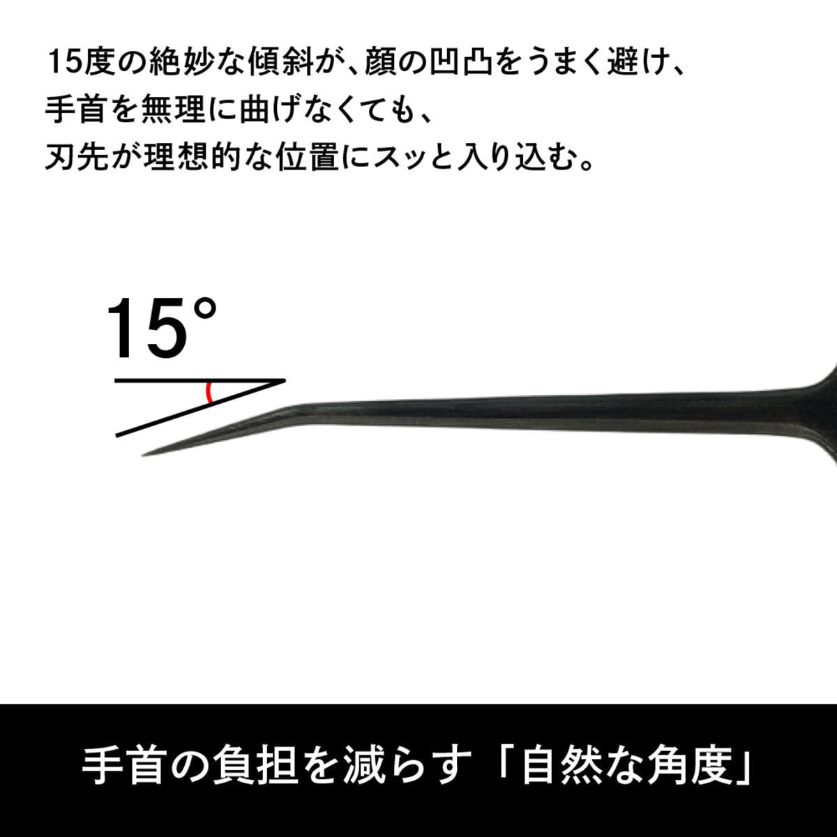 計算し尽くされた刃先15度の傾斜が、手首の負担を和らげる自然な操作感と死角のないクリアな視界を両立させ、届きにくい目頭から目尻までストレスなくスッと入り込みます。