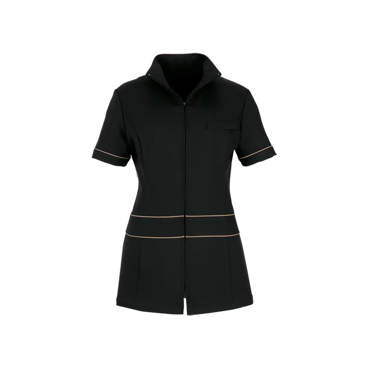 クール&エレガントなジャケット。ローウエストの切り替えとパイピングの配色が存在感のあるエレガントなジャケット。スタンドカラーの衿もとがクールです。パンツを合わせるとアクティブに作業がこなせます。同素材のパンツ(E-3104)や美脚ストレッチパンツ(E-3042)とのコーディネイトがオススメ。
