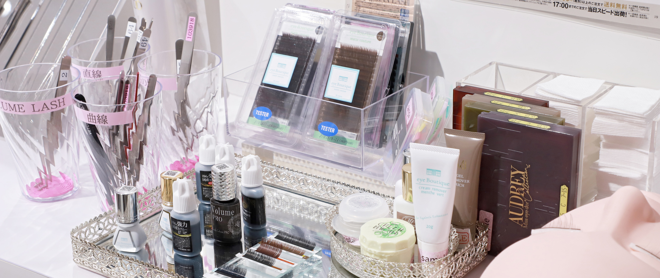 業界最大級305㎡のアイラッシュサロン向けのアイラッシュ商材・目元用化粧品・機器ショップです。サロンの営業前にお立ちよりいただけるよう、朝9時OPEN、夜も21時まで営業しております。